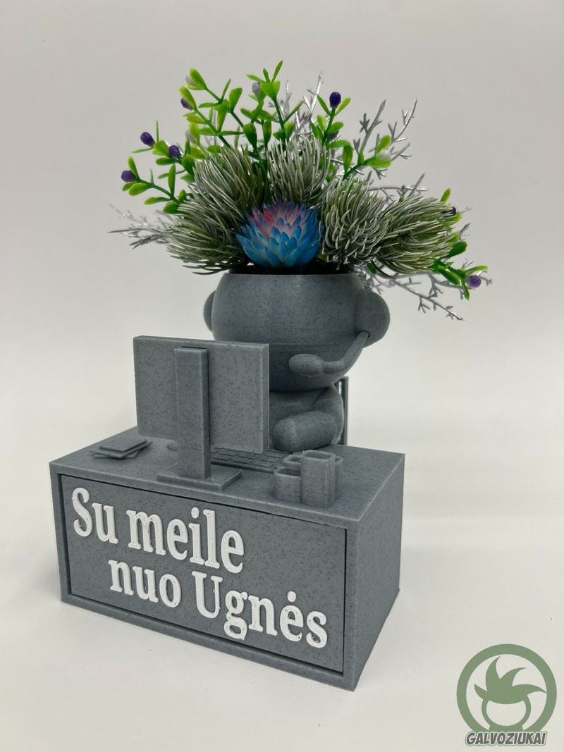 - KOMPLEKTE – žmogeliukas, ir prie jo galvytės pritaikytas specialus vazonėlis.